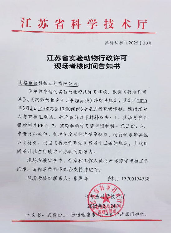江苏省实验动物行政许可现场考核时间告知书